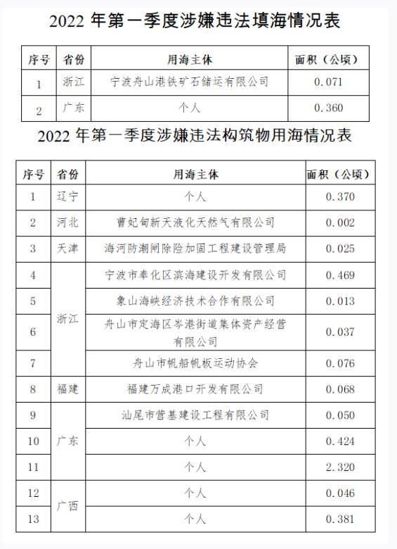 根据自然资源部最新通报,2022年第一季度,发现并制止涉嫌违法填海2处,涉及海域面积约0.43公顷。其中,浙江省1处,涉及海域面积约0.07公顷;广东省1处,涉及海域面积约0.36公顷。