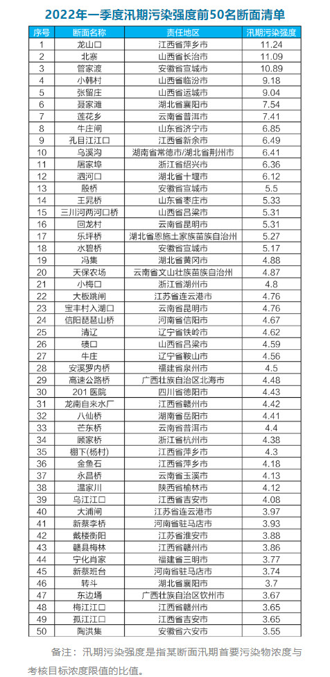 扣除自然因素影响,全国25个劣Ⅴ类断面分布在12个省份。其中,云南省数量最多,为7个。22个水质明显恶化断面分布在13个省份。其中,安徽省数量最多,为4个。全国汛期污染强度较大的前50个断面分布在15个省份,江西、湖北、云南省数量较多,占比为42.0%。其中,江西省萍乡市龙山口断面、山西省长治市北寨断面、安徽省宣城市管家渡断面汛期污染强度位于全国前三名。