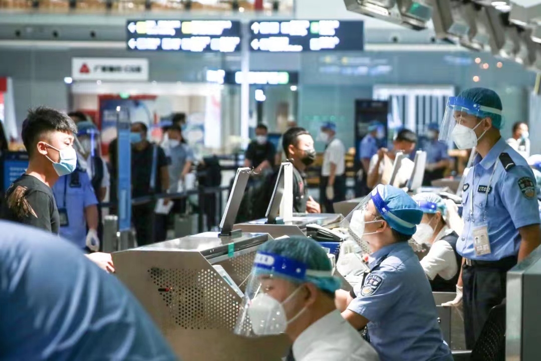 广州出入境边防检查总站白云边检站移民管理警察正在对出入境旅客进行查验。国家移民管理局供图