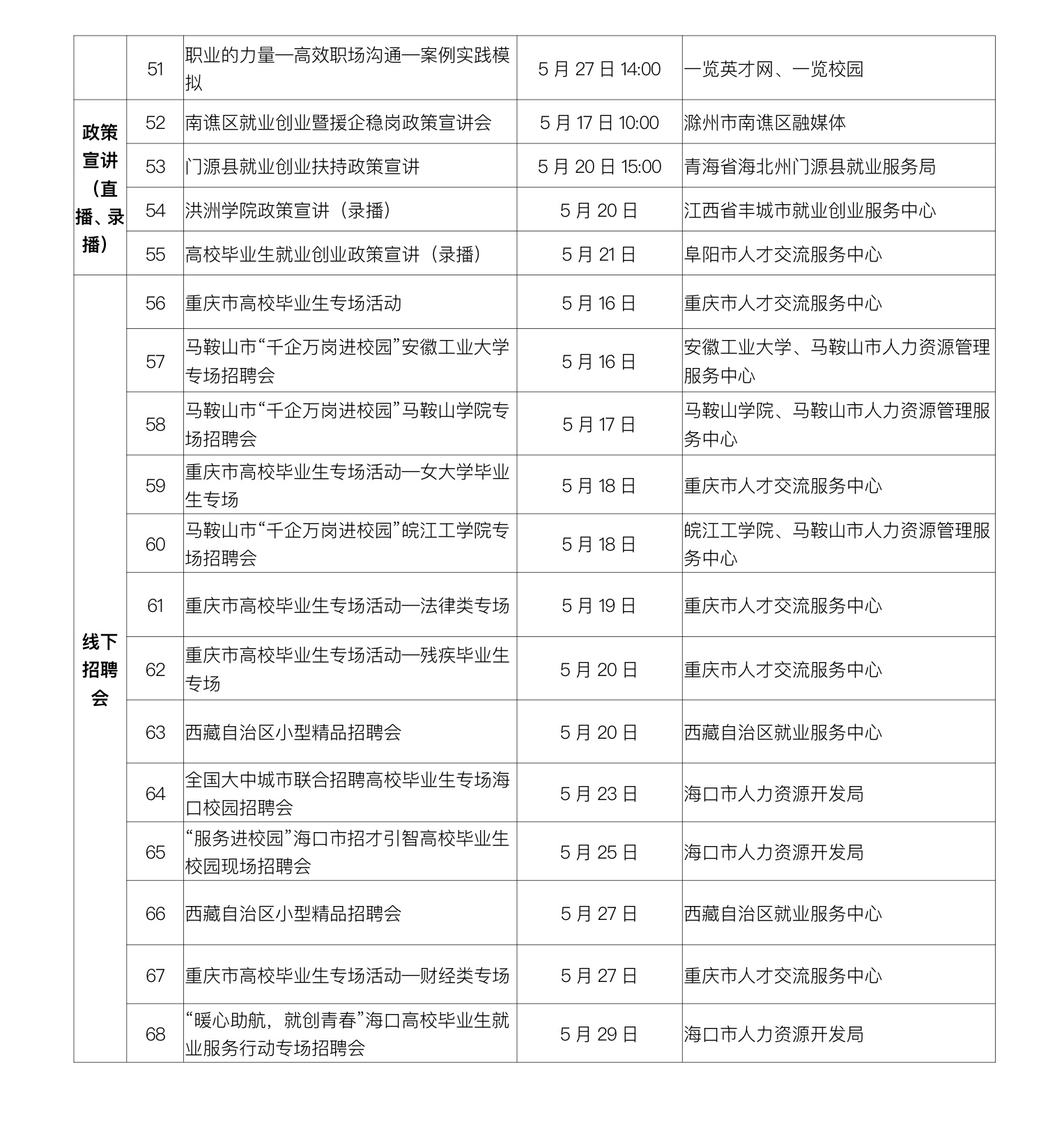 人民网北京5月16日电 (记者宋子节、温璐)近日,人社部2022年大中城市联合招聘高校毕业生专场活动将陆续推出第九批共68场特色服务活动。其中,线上活动55场,包括北京工业大学专场、首都经济贸易大学专场、旅游文化专场、生物医药及医疗卫生专场等线上专场招聘会23场,直播带岗18场,大学生求职陷阱套路、现场求职面试技巧等就业指导和政策宣讲直播(录播)课14场。线下活动13场,分别在重庆、海口、拉萨、马鞍山等地举办。