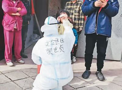 舍小家,为大家。难过归难过,第二天一早,我还是穿起防护服、腰间别上垃圾袋、绑上手消拿起试管,走街串巷、爬楼入户,为密接、次密接封控人员进行核酸采样。为确保采样标本合格,就要下手稳、准、狠,虽然也有极少数群众不理解,但我们都是耐心解释、毫无怨言。