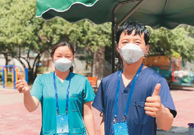 5月4日这天,没想到我和妻子被分到同一个核酸检测点位。这是这么多天以来我们两人第一次并肩作战,一个站在遮阳伞内,一个站在烈日之下;一个负责核酸采样,一个解答居民关于防疫方面的相关问题,各自忙碌着……核酸检测工作顺利完成后,我们脱下已经湿漉漉的隔离防护服,才有机会相互说上几句话,被口罩勒红的脸颊是我们共同努力的见证。“今天终于能一起吃个饭了,挺好。”妻子笑着对我说。