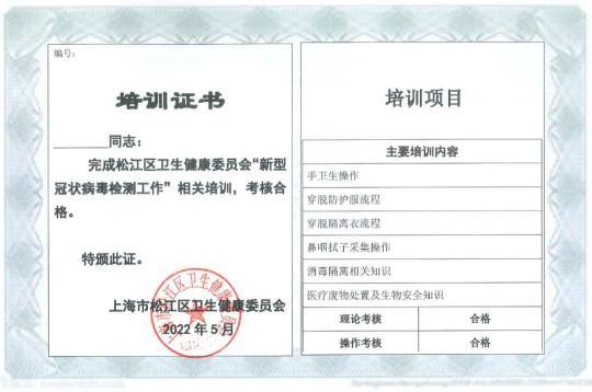 松江区卫生人才发展服务中心工作人员孙逸萍介绍,自4月30日起,全区17街镇、经开区已经陆续开展核酸采样志愿者培训工作。截至5月19日,累计颁发11030份培训证书。完成培训的志愿者,会根据各街镇的需求和组织,参与常态化核酸采样点和社区核酸筛查工作。