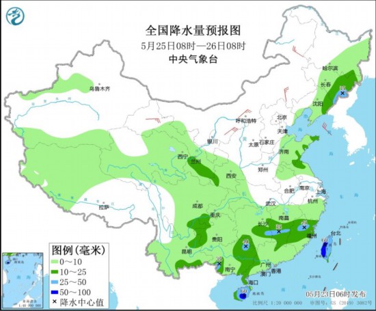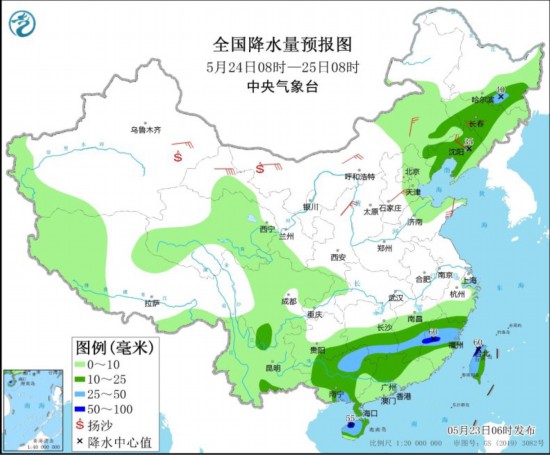 5月24日08时至25日08时,内蒙古东南部、黑龙江南部、吉林中部、辽宁大部、江南中南部、贵州东南部、华南西部和北部、台湾岛等地部分地区有中到大雨,其中,福建西部、海南岛、台湾岛等地部分地区有暴雨(50~60毫米)。内蒙古中西部、东北地区、甘肃西部、新疆南疆盆地东部、华北南部、山东半岛等地有4~6级风,其中内蒙古西部、甘肃西部、新疆南疆盆地等地部分地区有扬沙或浮尘天气,局地有沙尘暴。