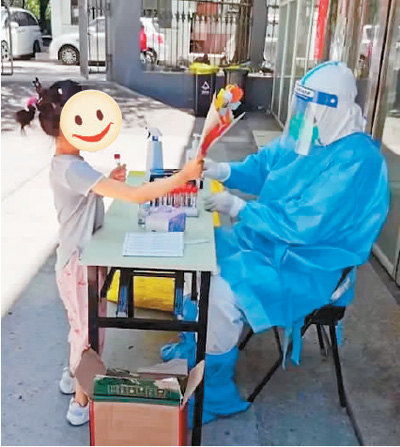 侍方刚给一位老人采完样本,进行手部消杀后抬起头时,眼前出现了一个小女孩,举着一束彩纸小花。侍方愣了一下,旁边社区工作人员说:“这是小姑娘做的手工花,想送给医生表示感谢。”拿着这束花,侍方突然觉得再热再累都值得。