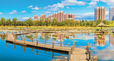 5月29日,内蒙古自治区呼和浩特市南湖湿地公园蓝天白云碧水相映,美景怡人。 |