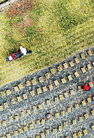 3月12日,浙江省台州市路桥区峰江街道一块田地里,农民正在起草坪。近年来,峰江街道通过发展花木产业、种植草坪等措施,借助绿植来净化土壤。 |