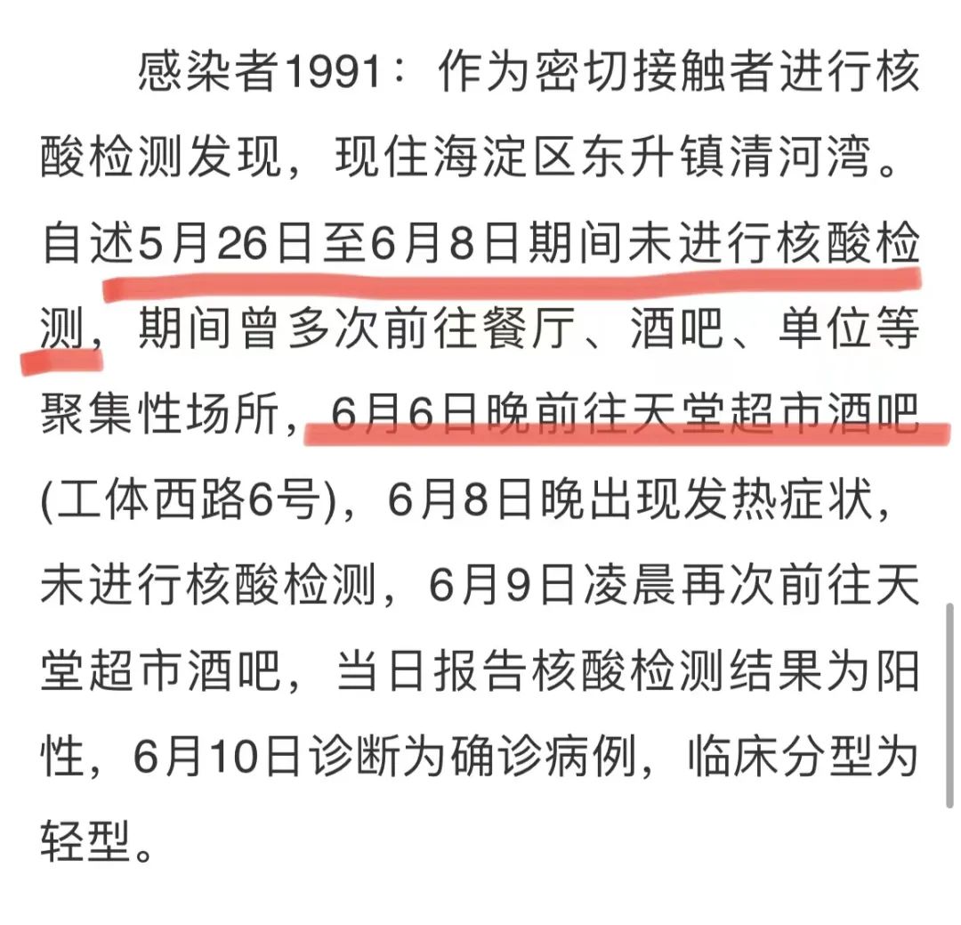 但是,就在6月10日,北京卫健委公布的“感染者1991”,自述5月26日至6月8日期间未进行核酸检测,6月6日晚前往天堂超市酒吧(工体西路6号),6月8日晚出现发热症状,未进行核酸检测,6月9日凌晨再次前往天堂超市酒吧……