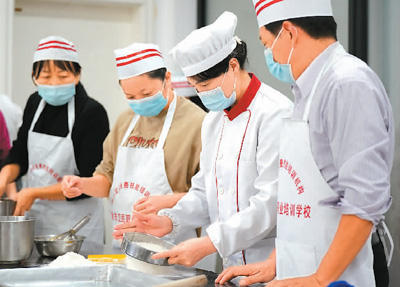 江西新余一家职业学校面点技能培训班上,学员正在跟随专业老师学习西式面点制作。 |