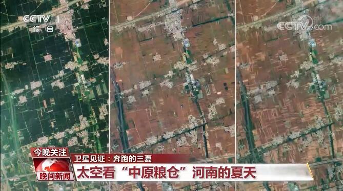 5月初,沃野千里的中原大地上,千万亩冬小麦还在抽穗、扬花,生机盎然;而到了24日,麦田已变成美丽的红棕色,一些地块率先开镰收割;到了5月底,麦田里的联合收割机来回穿梭。收割完的麦田变成了土黄色,收割机身后则留下一排排整齐的麦茬,这是地球给太空展示的丰收画卷。