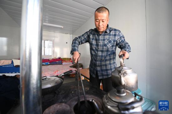 12月29日,在积石山县刘集乡高李村板房安置点,村民往火炉中加煤块。新华社记者 范培珅 摄