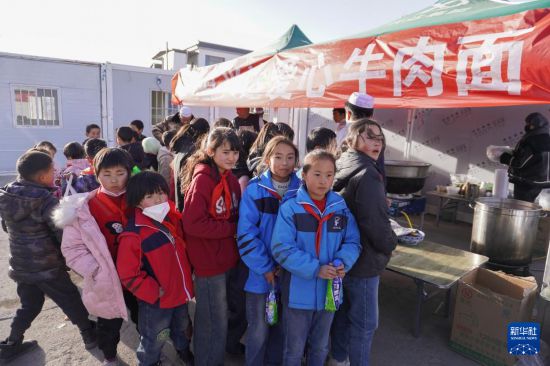 12月29日,在积石山县柳沟乡尕集村板房安置点,学生们放学后等待吃饭。新华社记者 马希平 摄