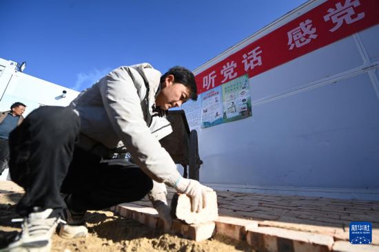 12月29日,在积石山县石塬镇沈家坪村板房安置点,村民给板房外道路铺砖。新华社记者 范培珅 摄