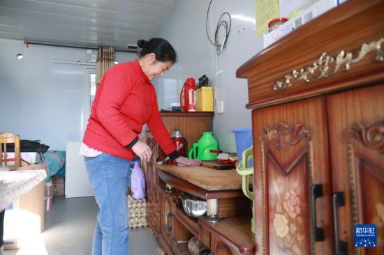 12月29日,在积石山县石塬镇沈家坪村板房安置点,村民在板房内打扫房屋。新华社记者 张睿 摄