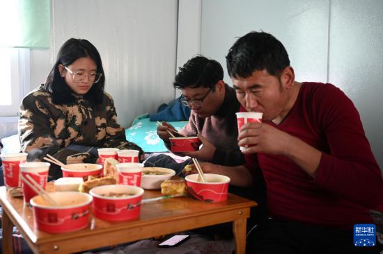 12月29日,在积石山县大河家镇大河村板房安置点,受灾群众在板房内吃饭。新华社记者 范培珅 摄