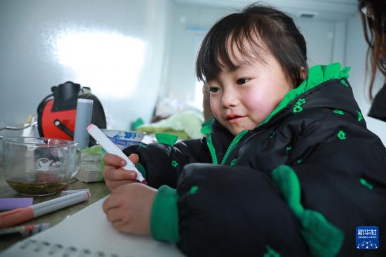12月29日,在积石山县大河家镇大河村板房安置点,一名儿童在板房内画画。新华社记者 张睿 摄