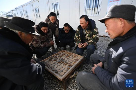 12月29日,在积石山县石塬镇石塬村板房安置点,村民在下象棋。新华社记者 范培珅 摄
