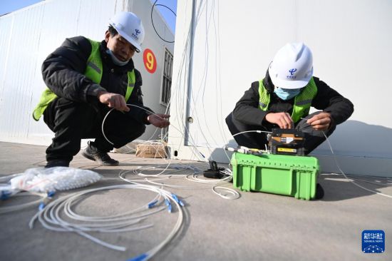 12月29日,在积石山县大河家镇大河村板房安置点,中国电信工作人员为板房接通光纤。新华社记者 范培珅 摄