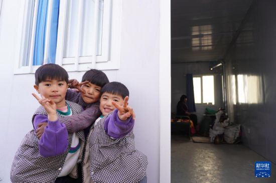 12月29日,在积石山县柳沟乡尕集村板房安置点,小朋友在板房门口玩耍。新华社记者 马希平 摄
