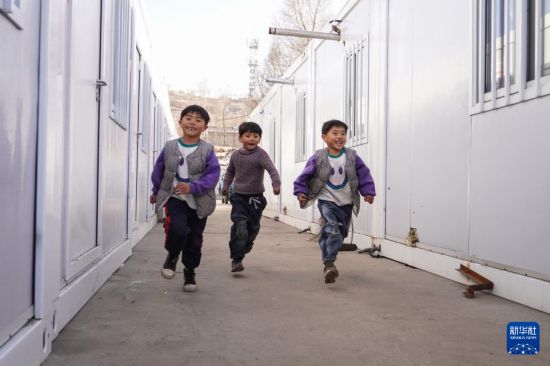 12月29日,在积石山县柳沟乡尕集村板房安置点,小朋友在板房间玩耍。新华社记者 马希平 摄