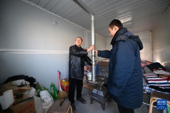 12月29日,在积石山县大河家镇大河村板房安置点,受灾群众安装火炉烟囱。新华社记者 范培珅 摄