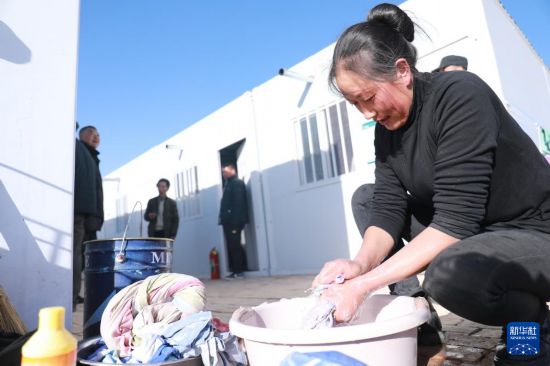 12月29日,在积石山县石塬镇沈家坪村板房安置点,村民在板房外洗衣服。新华社记者 张睿 摄