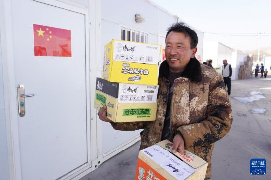 12月29日,在积石山县刘集乡高李村板房安置点,受灾群众领取物资。新华社记者 马希平 摄