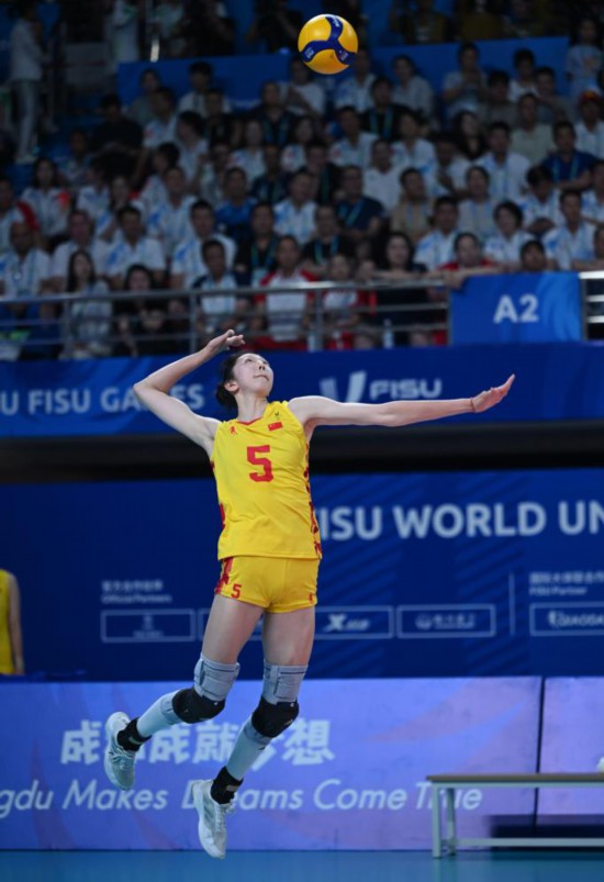 8月6日,吴梦洁在第31届世界大学生夏季运动会女子排球金牌赛中发球。新华社记者 胥冰洁 摄