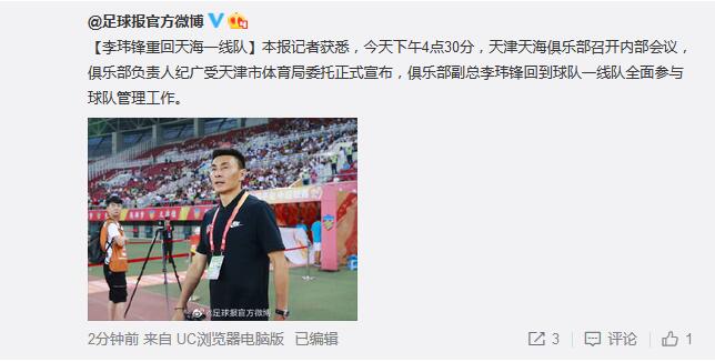 中超 / 李玮锋重回天海一线队 全面参与球队管理工作