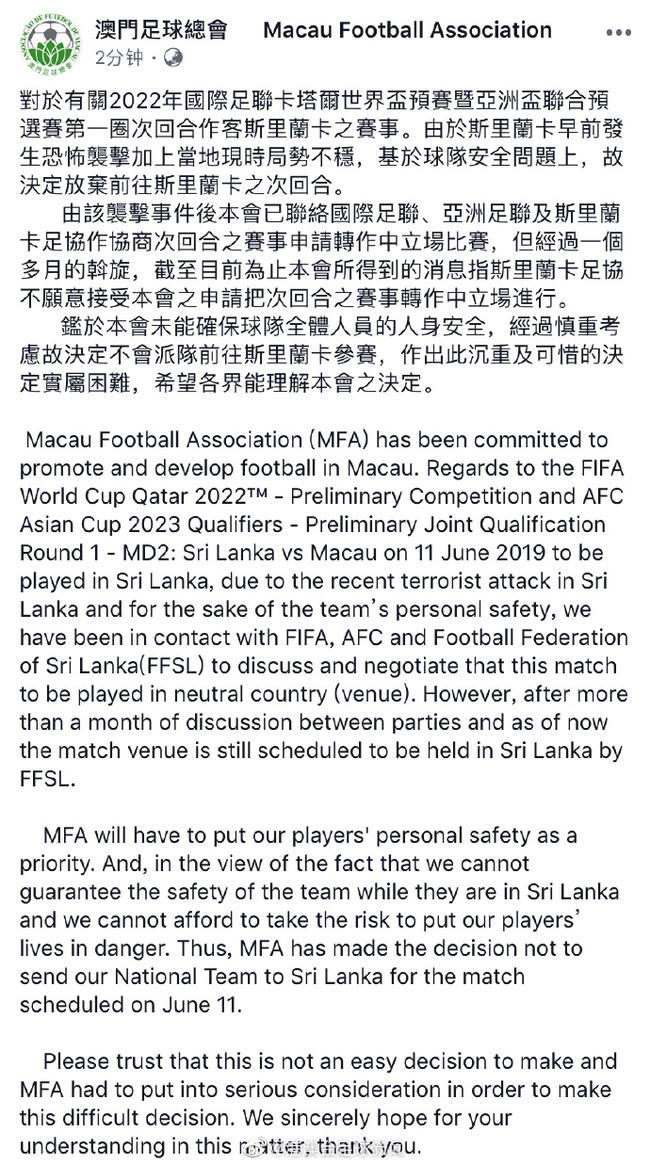 中国澳门放弃客场 成首支2022世界杯出局球队