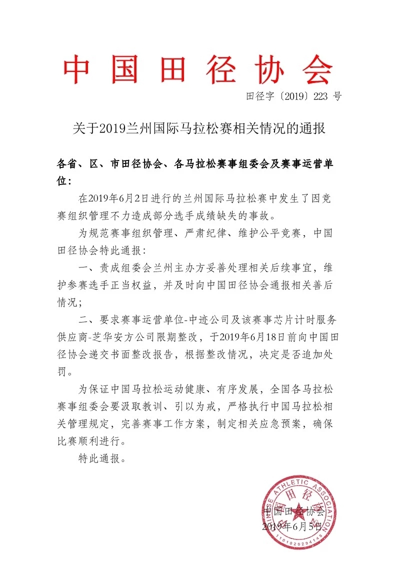 中国田协通报兰马成绩缺失问题:维护选手权益 限期整改