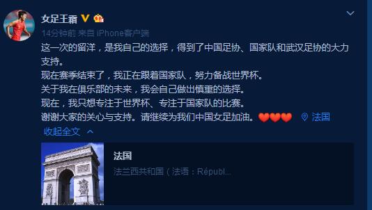 王霜回应提前结束留洋传闻:将慎重选择 专注世界杯