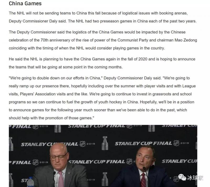 NHL中国赛今年暂停 预计明年回归