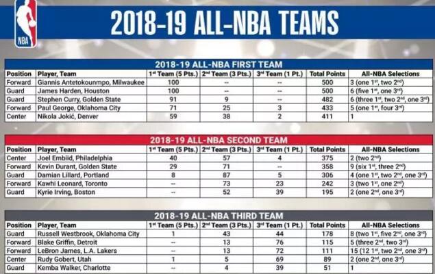 NBA公布赛季最佳阵容 哈登库里字母哥入选“一阵”