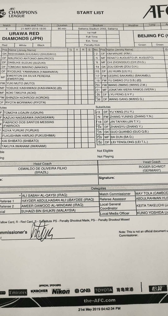 亚冠 / 国安公布首发:吕鹏、刘欢、王子铭首发